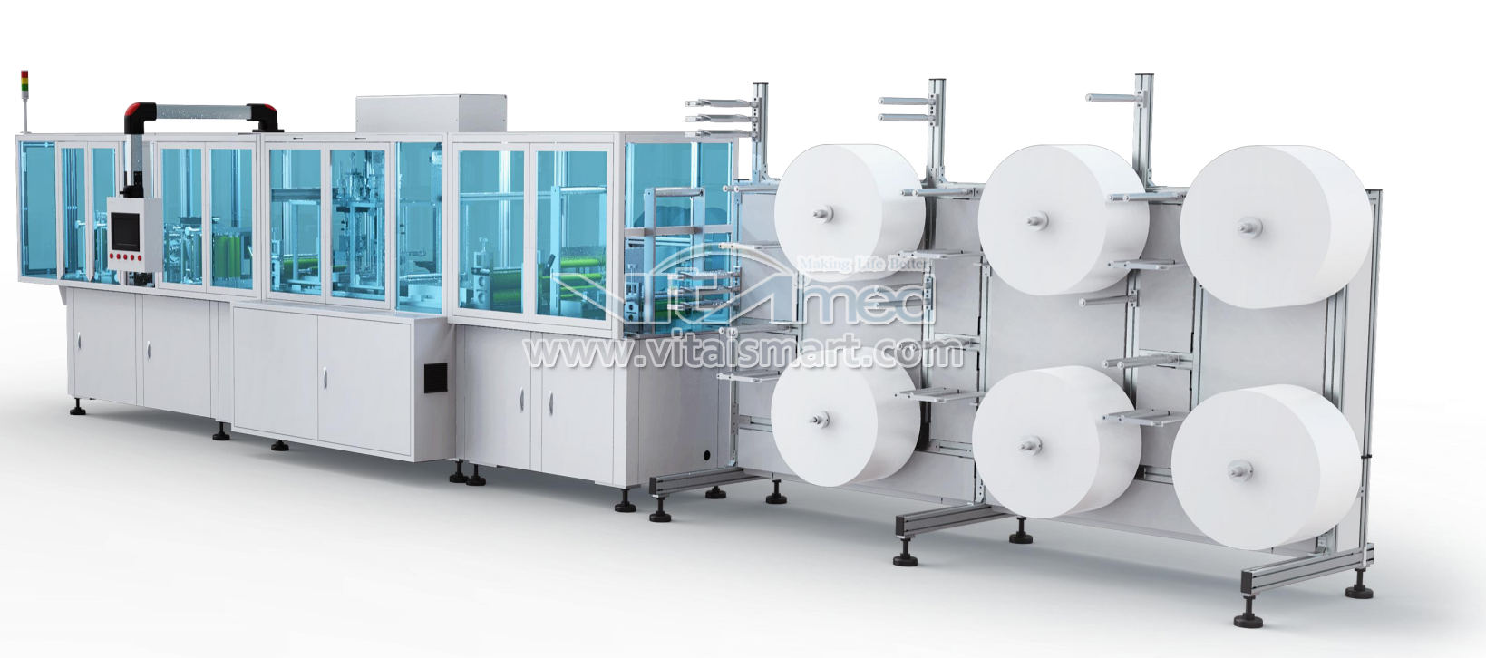The automatic production line of disposable face masks includes automatic processes such as roll material feeding, nose bridge clip feeding, mask forming, ear wire welding, and finished product blanking. Applicable mask types: surgical masks, ordinary medical masks and 2-4 layers of PP non-woven fabric and composite fiber material masks.